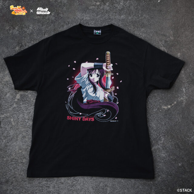■Short sleeve tee “SHINY DAYS”は、『School Days』スピンオフ作品である『SUMMER DAYS』のリメイク作となる『SHINY DAYS』より、居合の達人である桂言葉が刀を握ったイラストをメイングラフィックに採用。