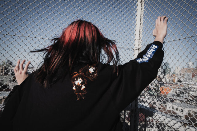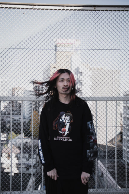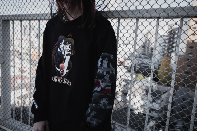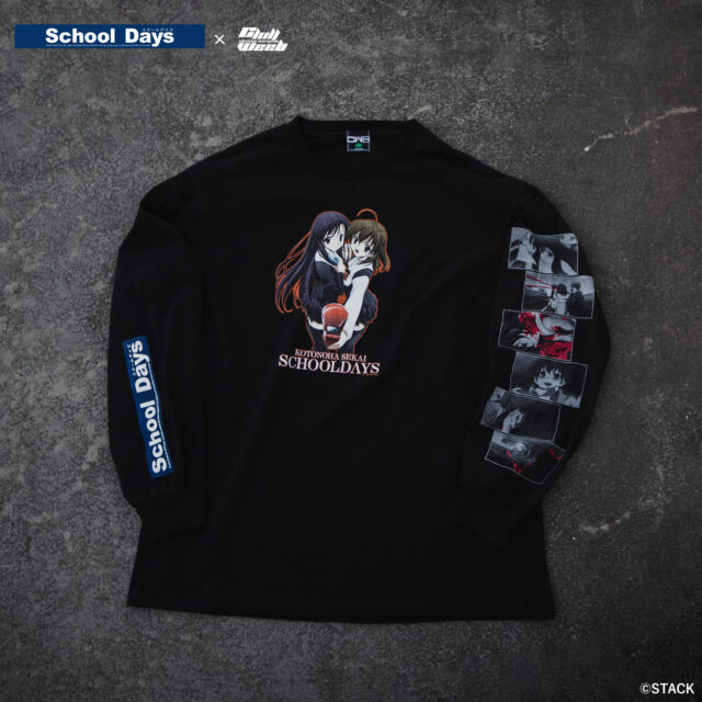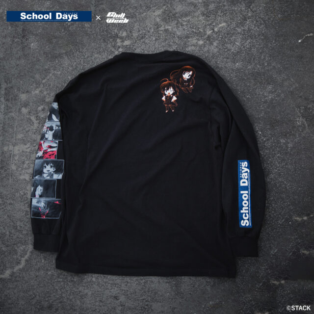 ボディは6.0オンスのヘヴィーウェイトロングスリーブTシャツを使用し、プリントは合計14版のシルクスクリーンを採用。背面にはミニキャラをプリントすることで『School Days』らしさを詰め込んだ一枚となりました。