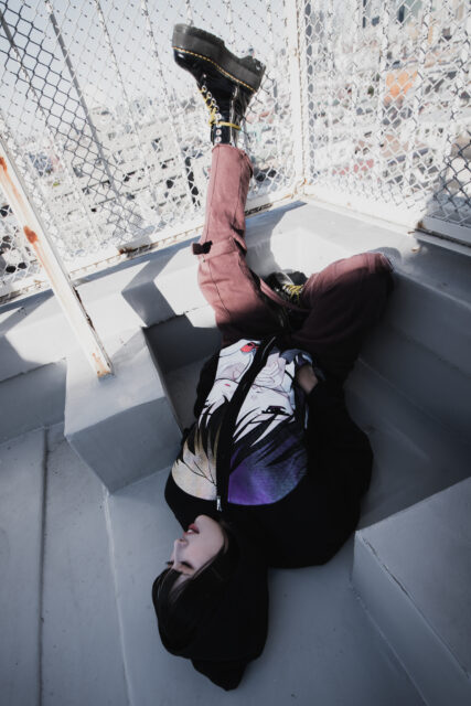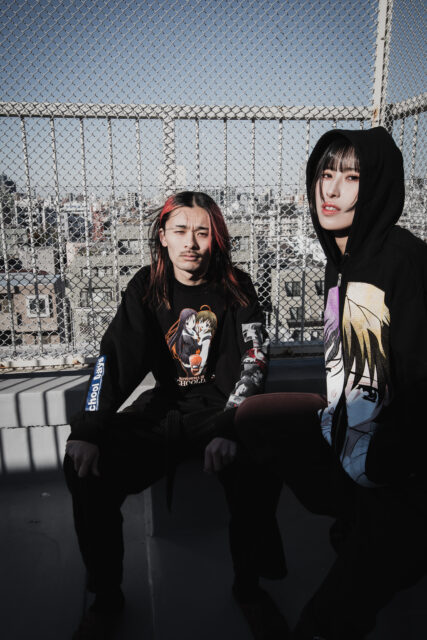 ■Zip-up hoodie “HALF FACES”は小説版の表紙イラストを採用し、縫い目にかかるシルクスクリーン特大版によるプリントに挑戦した一枚。ハンドプリントならではの縫い目にインクがかかる仕様と、粗さをあえて表現したデザインで他に類をみないフーディーとなりました。