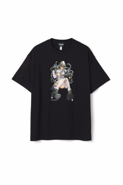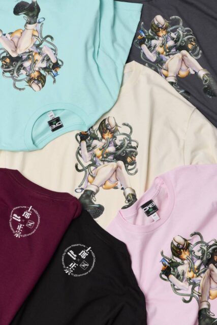 Tシャツのメイングラフィックとして、現役で『comicアンスリウム』にて成人向けイラストを寄稿されている士郎正宗氏の側面をフックアップすべく、書き下ろしをオーダーいたしました。